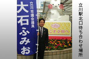 追伸 本年6月に予定されております、次期立川市議会議員選挙に、私、大石ふみおは出馬せず引退を致します。なお後継として佐々木まさたか氏の擁立を予定しております。5期20年の長きに渡り、ご支援とご協力に心より感謝申し上げます。ありがとうございました。